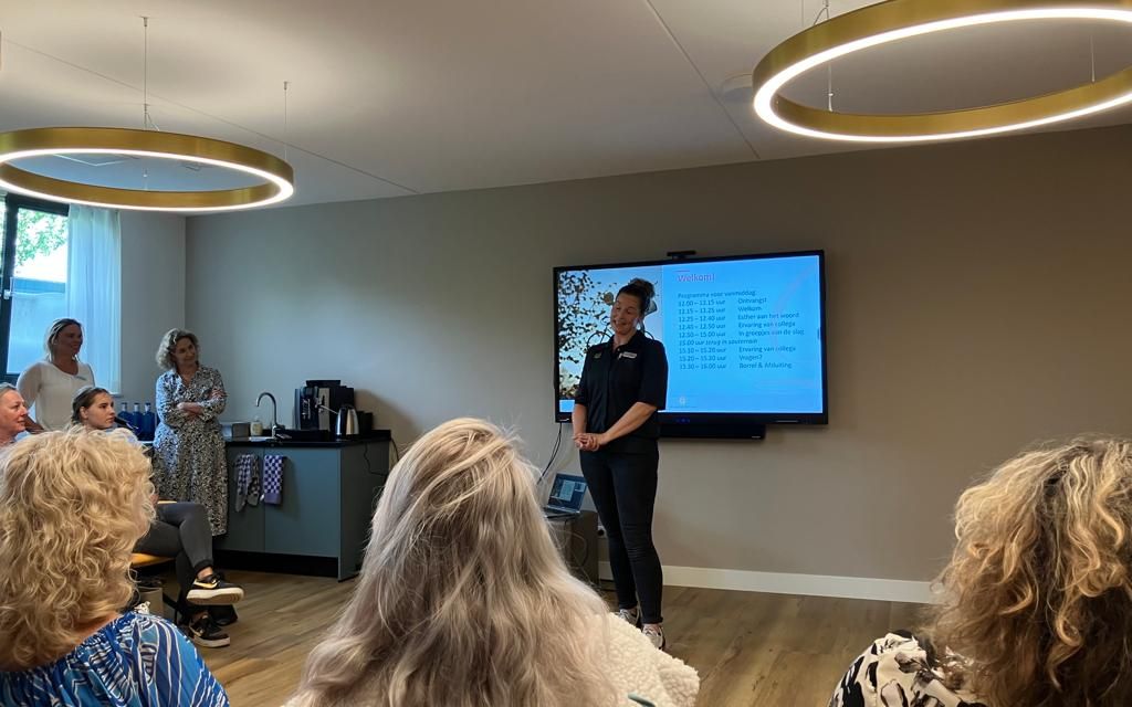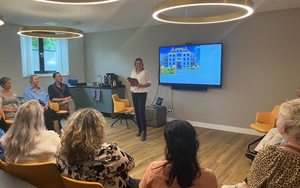 Vervolgens neemt Esther van Dalen (algemeen directeur) het woord over. Zij vertelt waar Zorggroep De Laren voor staat en wat belangrijk is als je nieuw komt werken bij een van de villa’s, waar je terecht kan met vragen en waar het centraal kantoor je bij kan helpen.