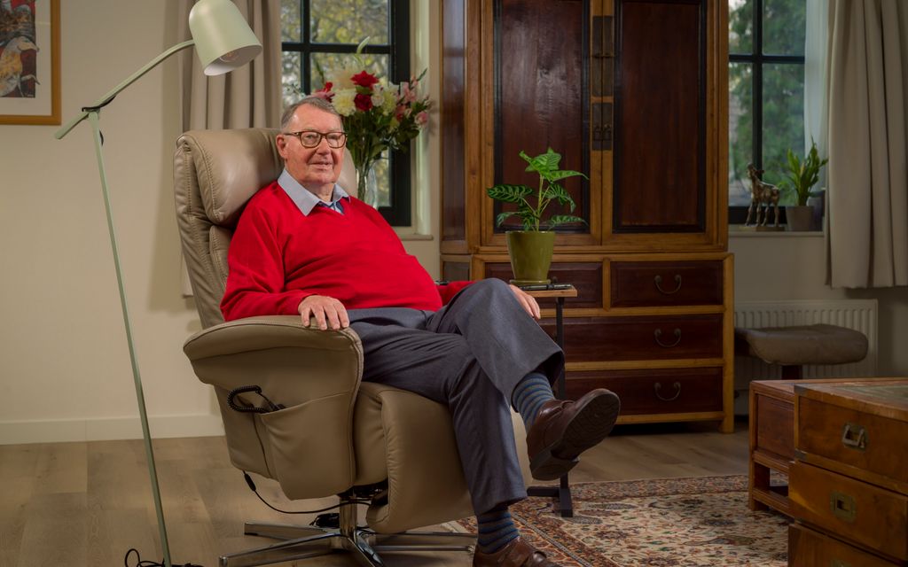 Als rasechte Hilversummer voelt de heer Van Gestel zich prima op zijn plek in Villa Marijke Elisabeth. Na zijn pensionering woonde hij twintig jaar in een flat, nog geen 500 meter verderop. Na allerlei ziekenhuisbezoeken opperde zijn zoon of het toch niet beter zou zijn als hij eens verzorgd zou gaan wonen. Hij was het met zijn zoon eens, maar dacht ook: ik kom op een wachtlijst, het duurt nog wel een jaartje. Maar al snel kreeg hij een telefoontje van zijn zoon, er was een appartement vrij in Villa Marijke Elisabeth.