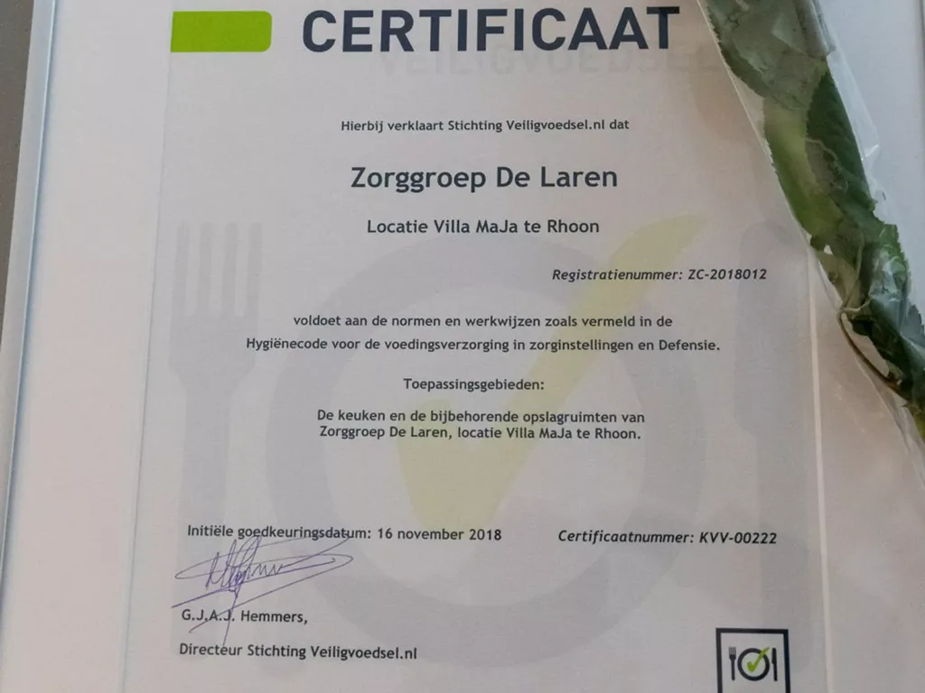 Op vrijdag 10 mei was het zover. In Villa Sluysoort in Maarssen werden de certificaten van de Veilig Voedsel Award uitgereikt aan de winnaars van Zorggroep De Laren.