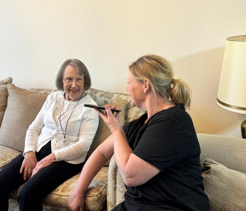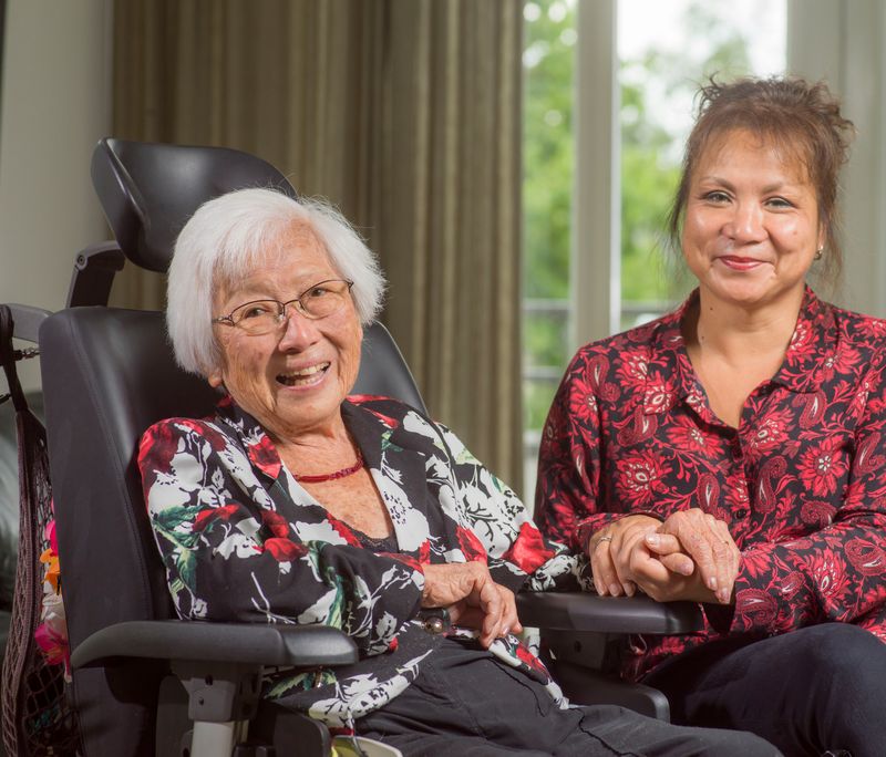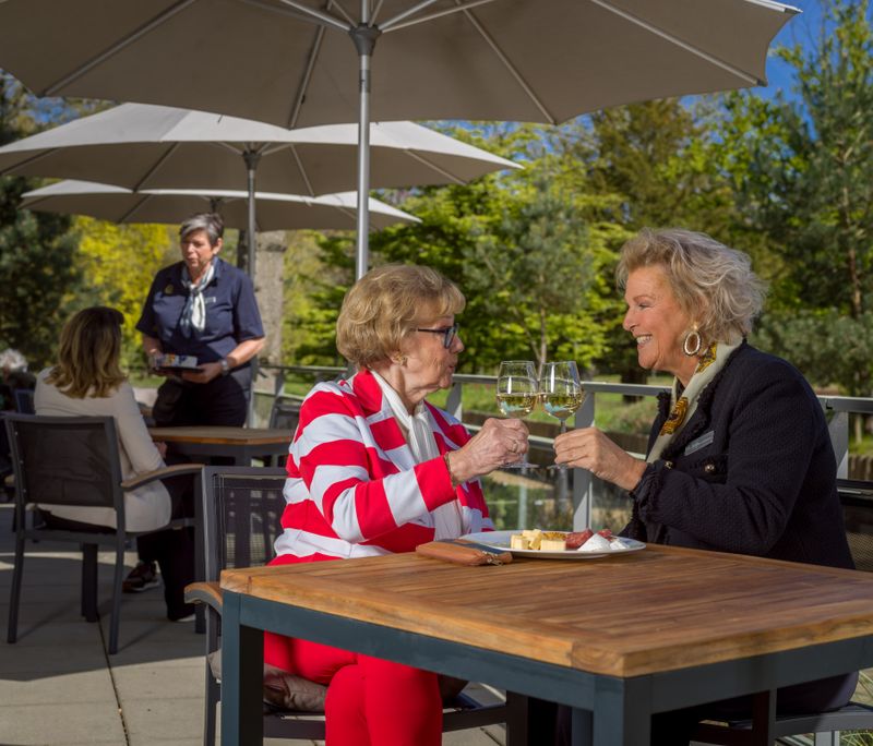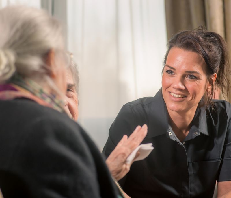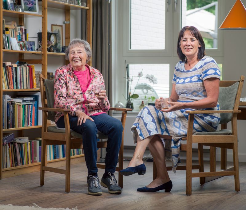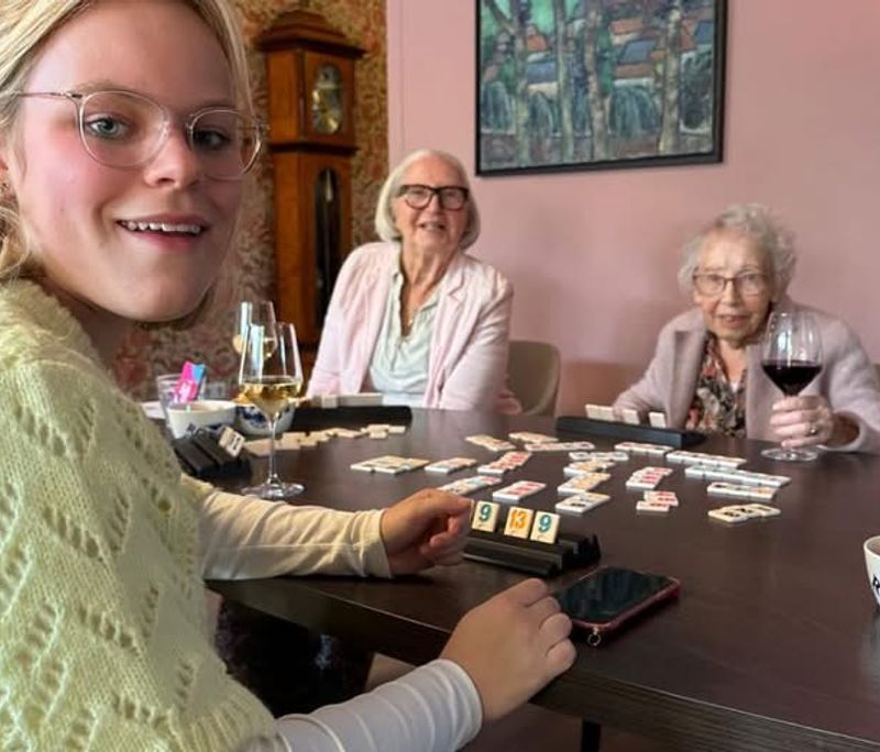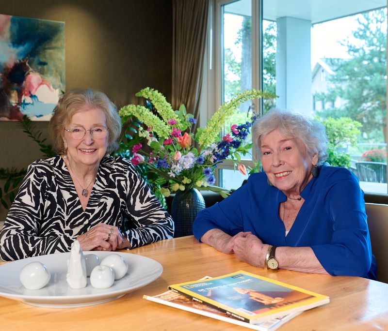 Mevrouw Zandbergen geniet samen met onze horecamedewerker Barbara van een heerlijk wijntje en hapje. Inmiddels is ze aardig ingeburgerd in de villa. Lees het hele verhaal.